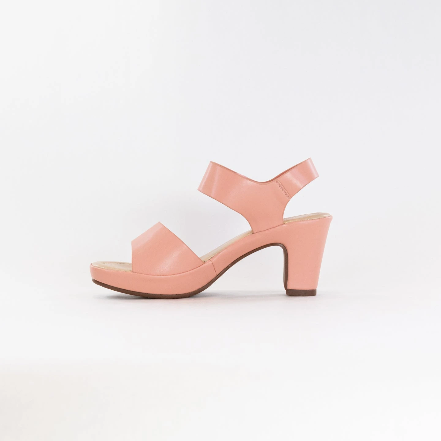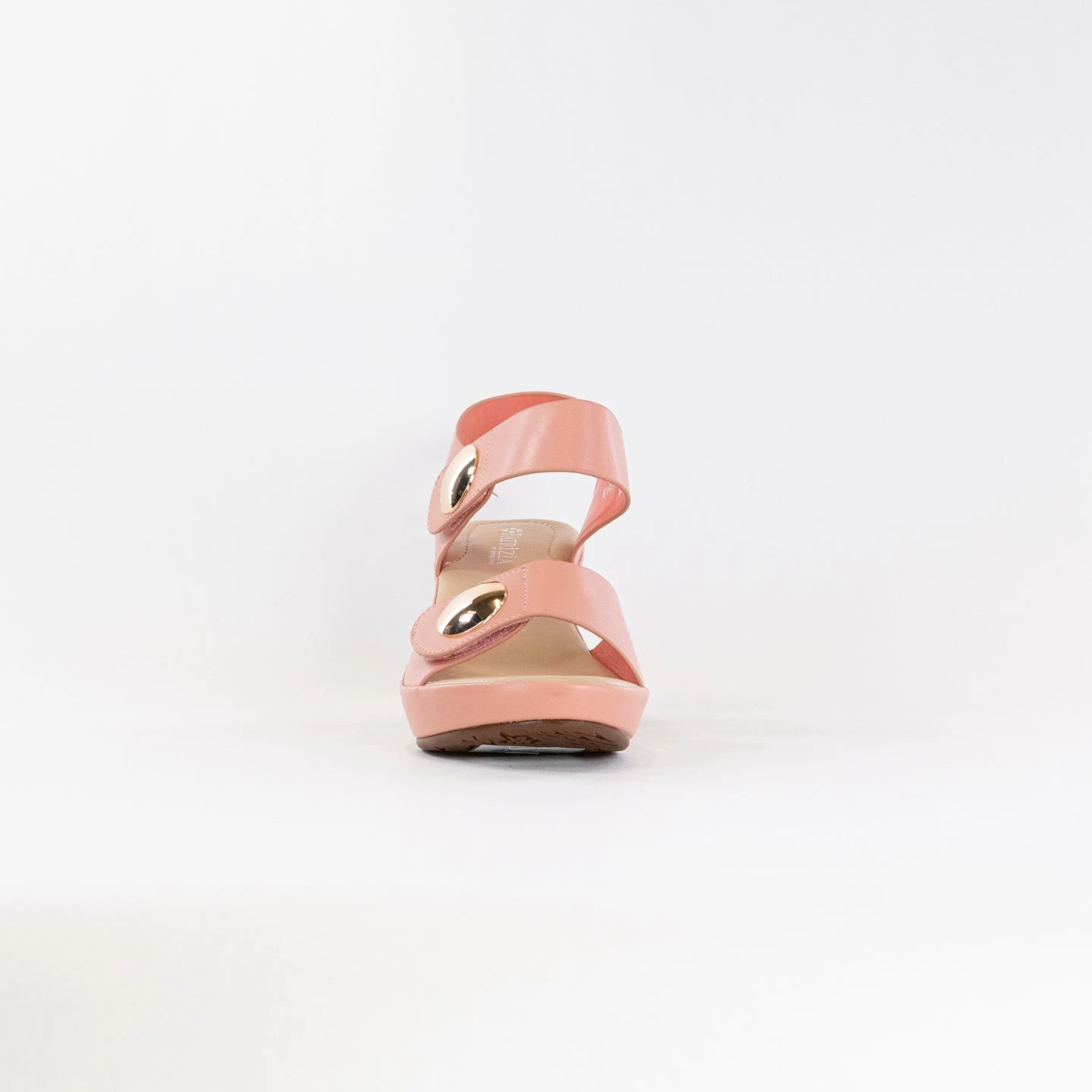 Trendy quarter strap sandal featuring a beautiful wide band design and adjustable hook and loop straps with polished metal ornaments all on a sophistication-inspired, comfort heel with a platform.