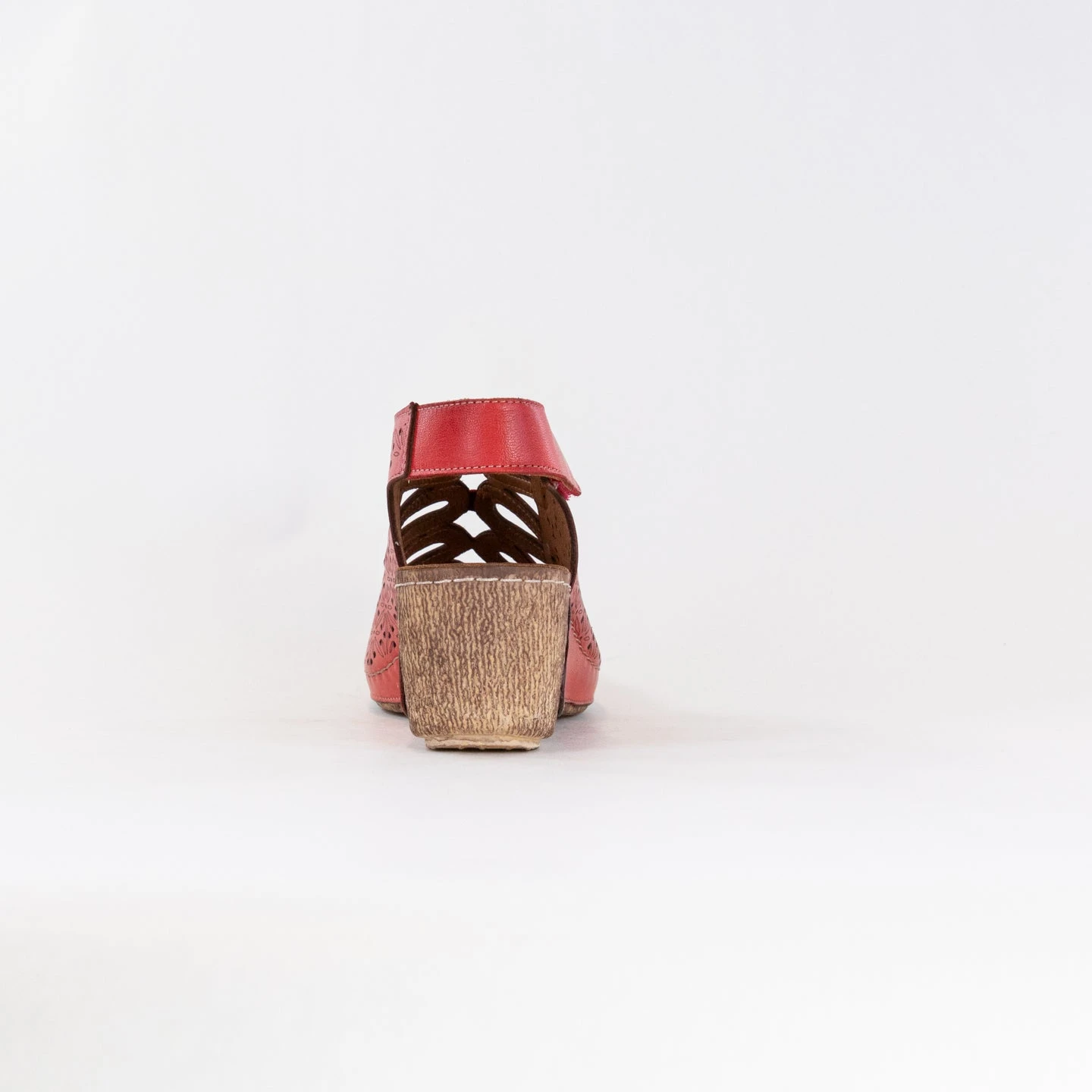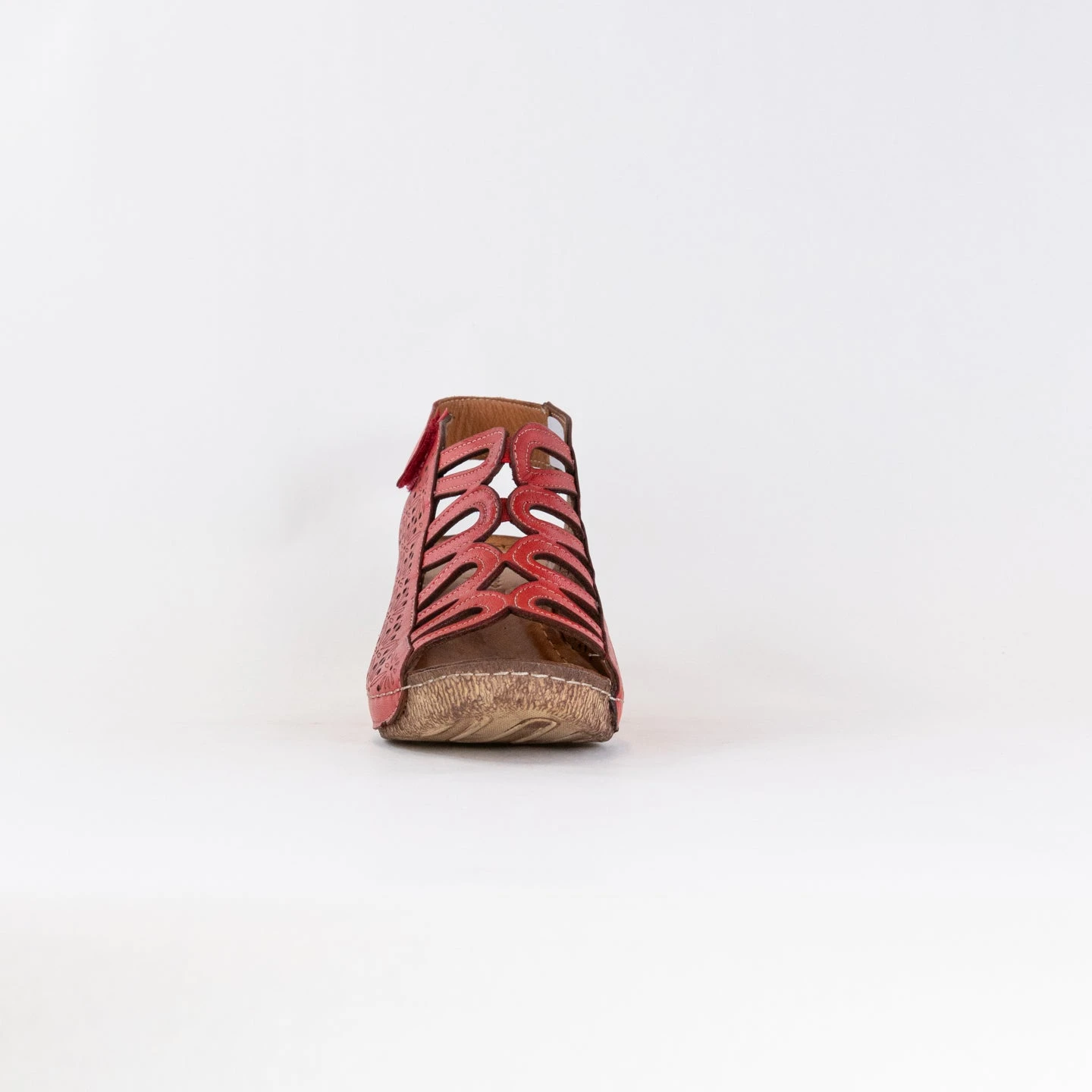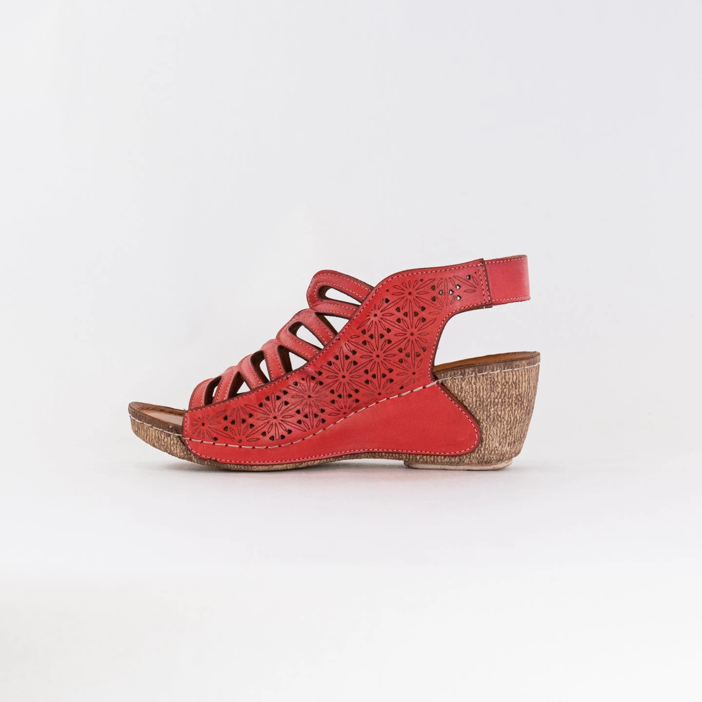 Mediterranean influenced, premium leather sandal featuring a beautiful laser etched floral cutout design for increased flexibility and breathability. The tear drop pattern at the top of the shoe give it a playful edge. The strong stitched to sole construction give it durability and the comfort wedge with a flexible forefoot provide an easy wear.
