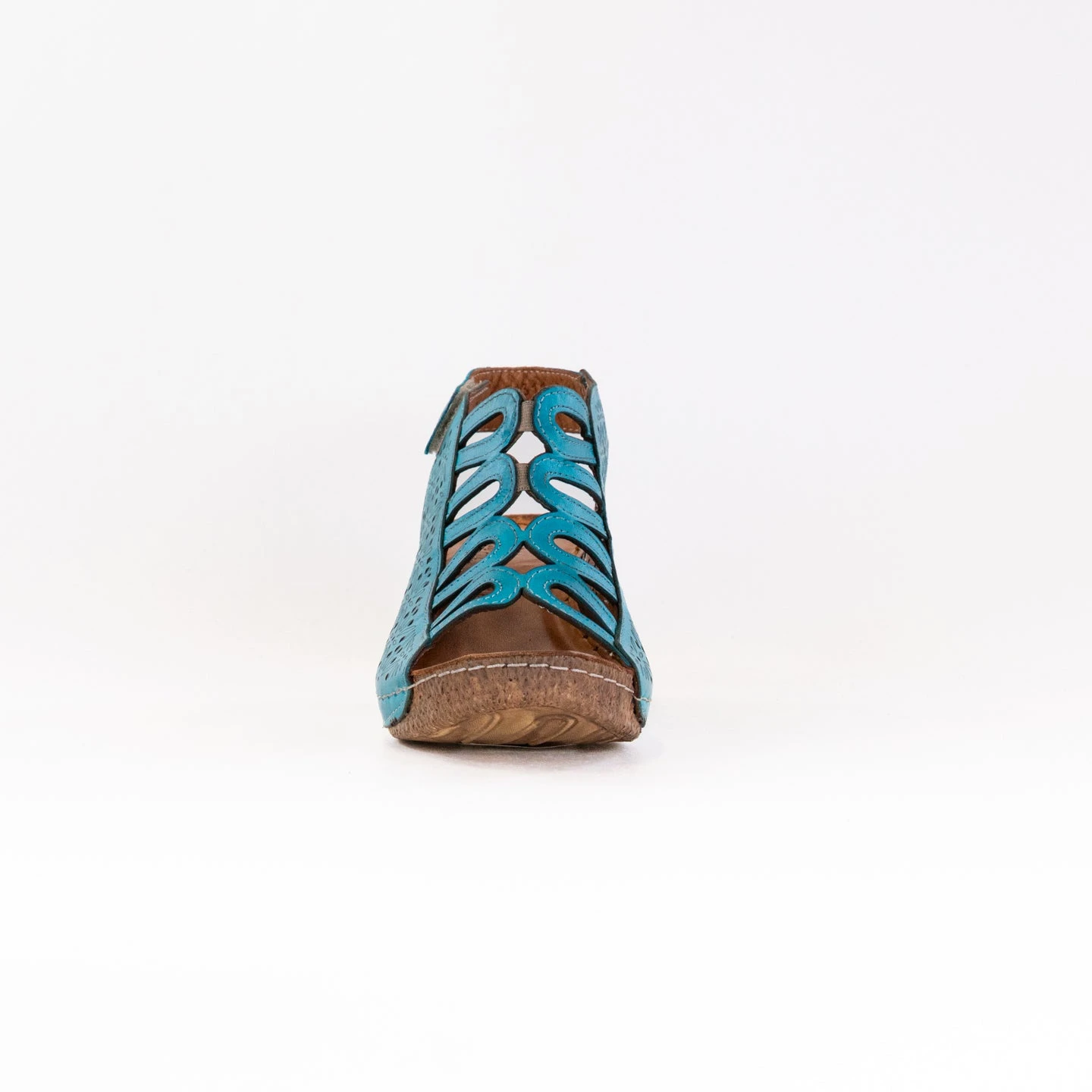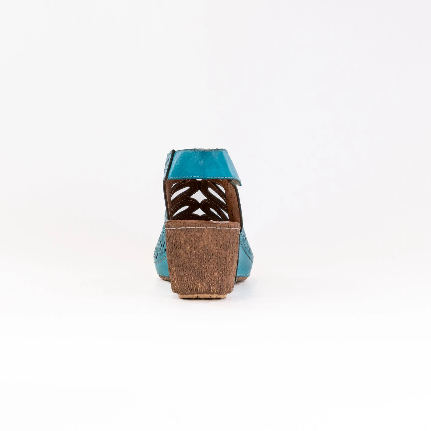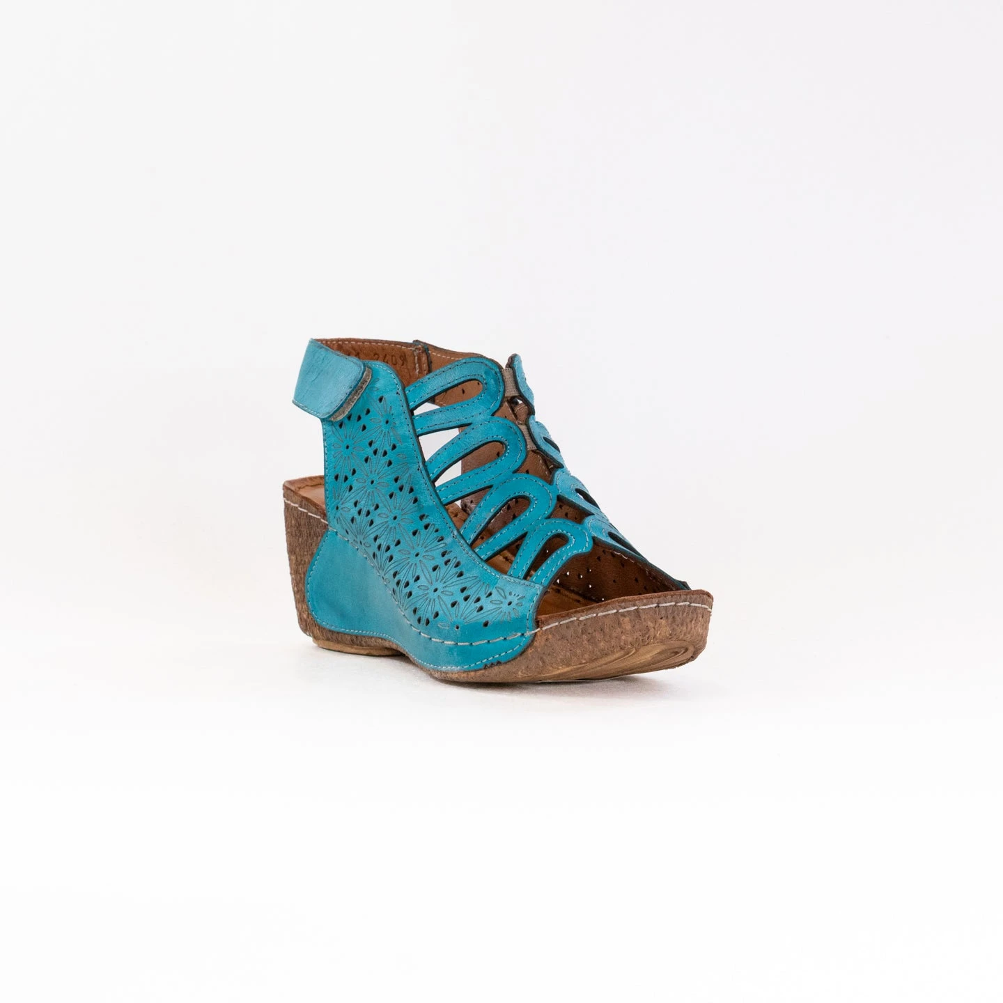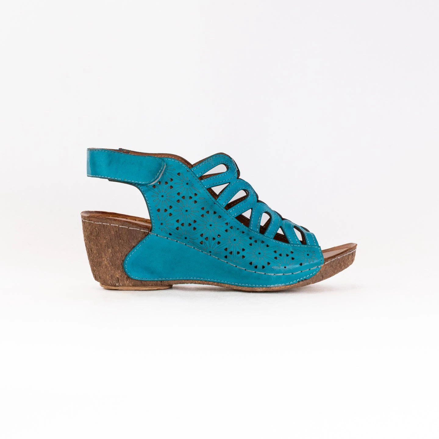 Mediterranean influenced, premium leather sandal featuring a beautiful laser etched floral cutout design for increased flexibility and breathability. The tear drop pattern at the top of the shoe give it a playful edge. The strong stitched to sole construction give it durability and the comfort wedge with a flexible forefoot provide an easy wear.