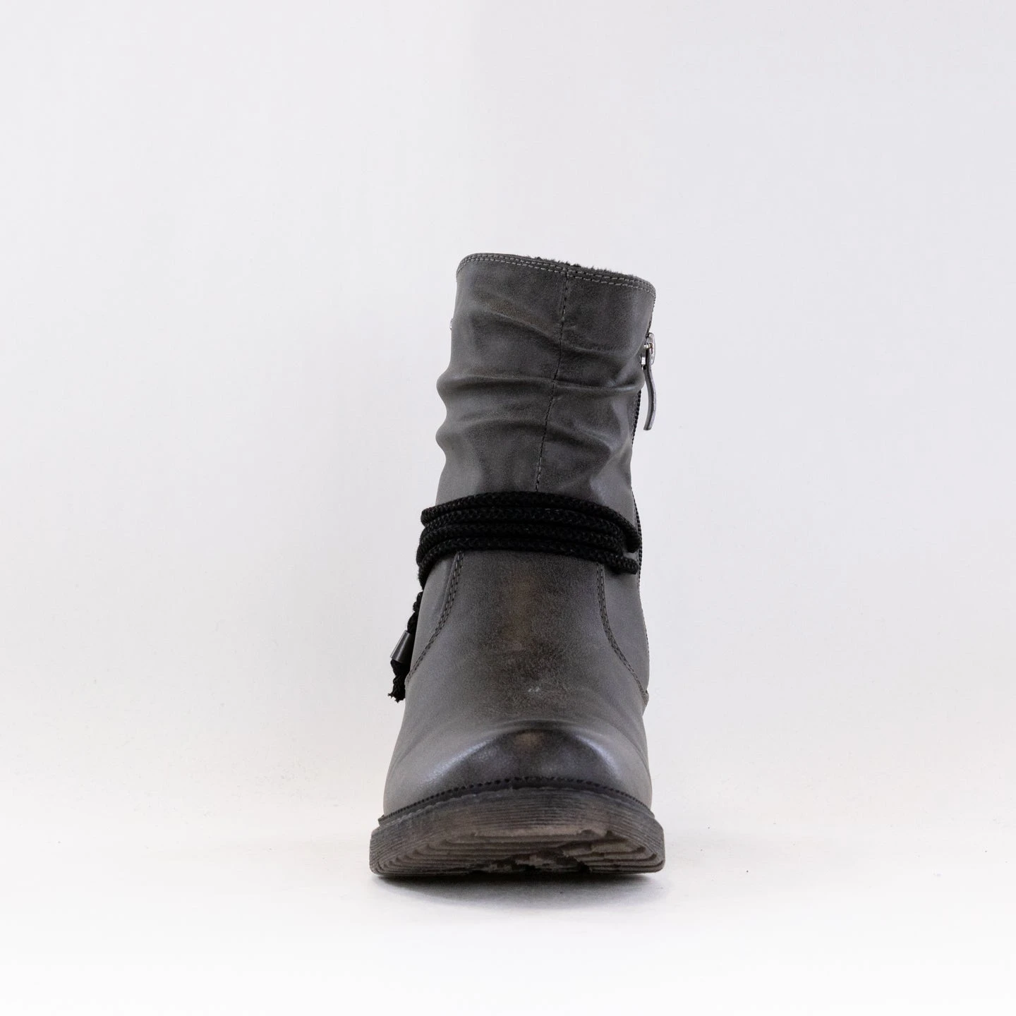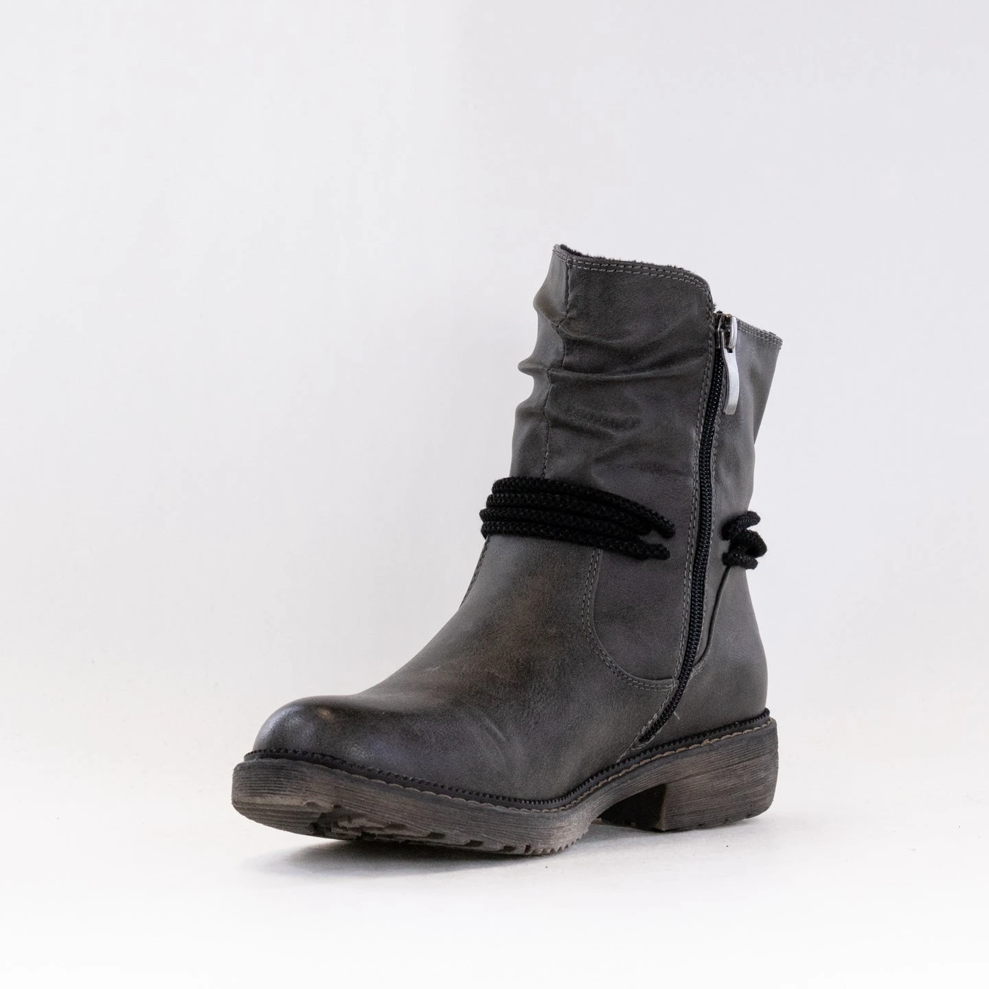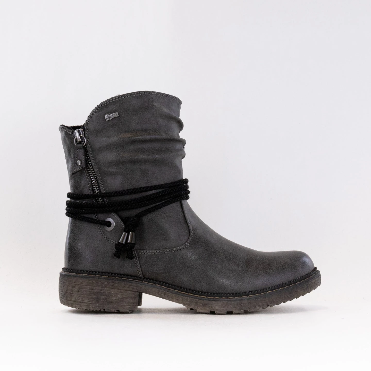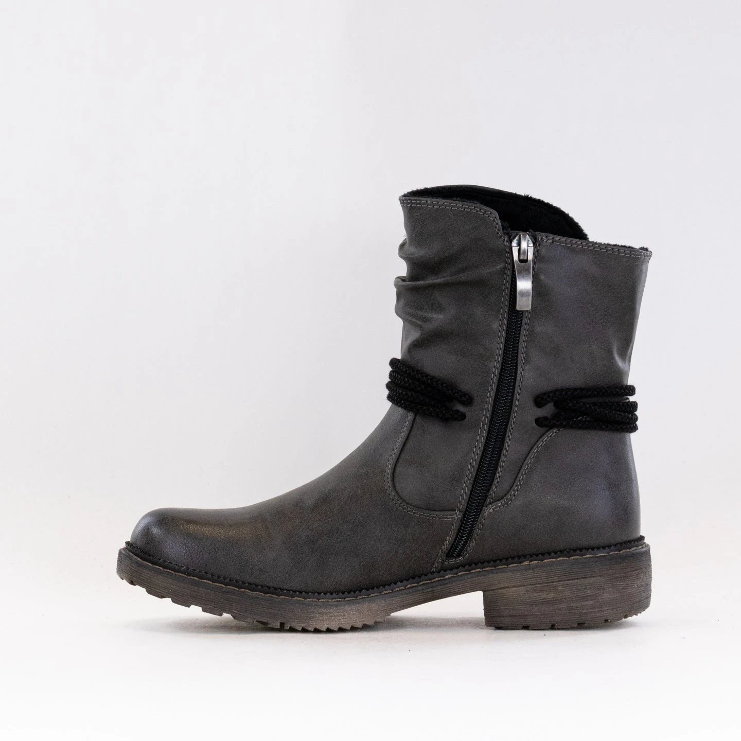 Trendy and functional water resistant mid boot featuring a slouchy shaft design with decorative rope laces at the ankle and a profile zipper with expanding gusset for adjustability.