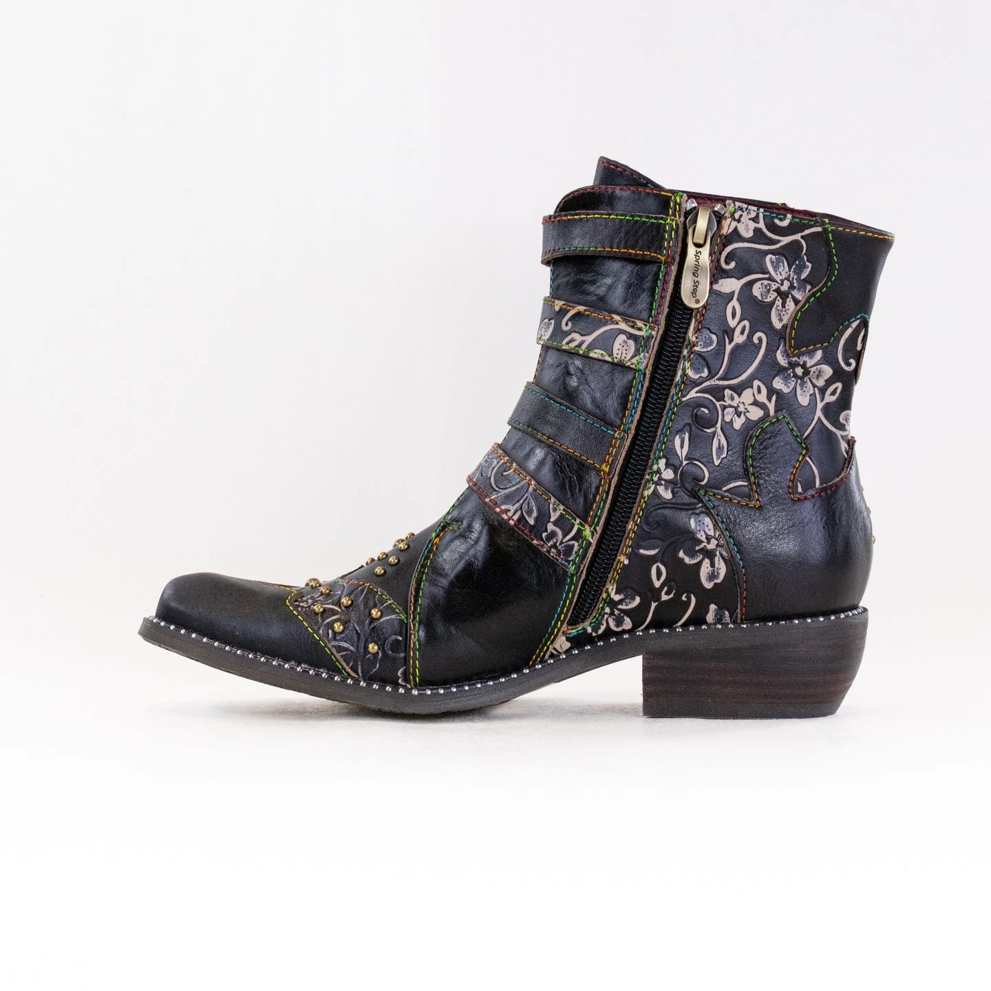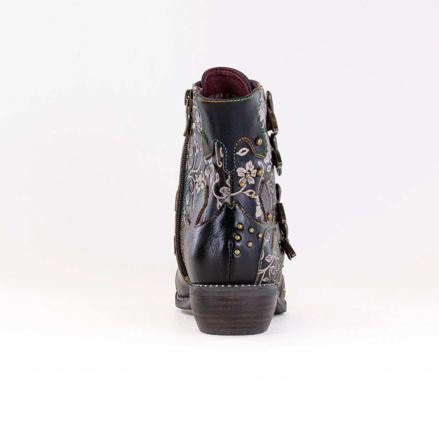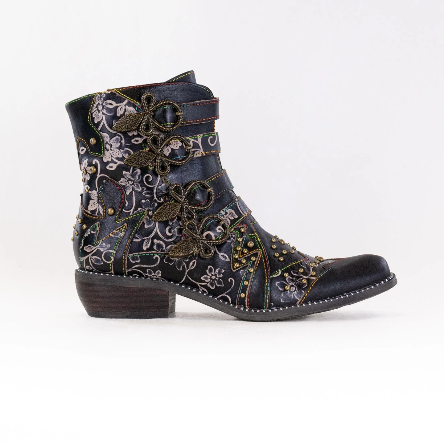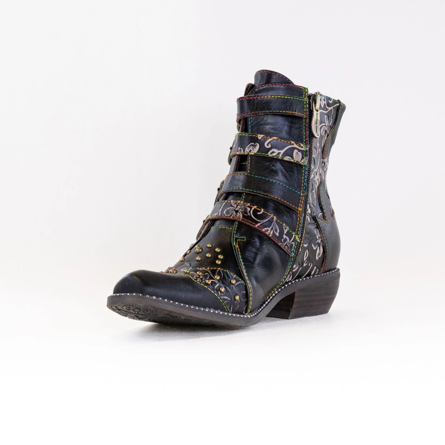 A beautiful western style bootie with a Victorian flavor, with amazing four(4) strap refined bow style antique buckles and end strap embellishments, in a combination of full grain burnished polished leather and embossed two tone floral designed hand painted leather.