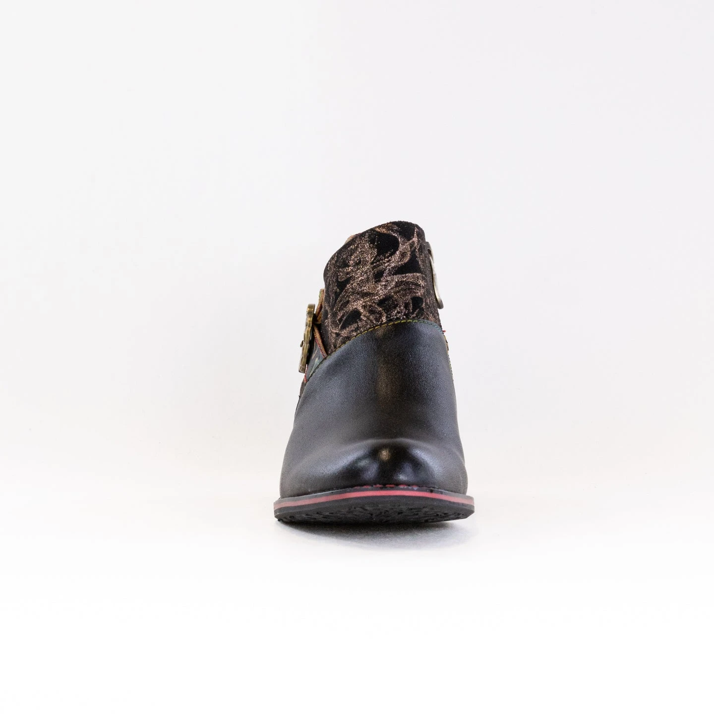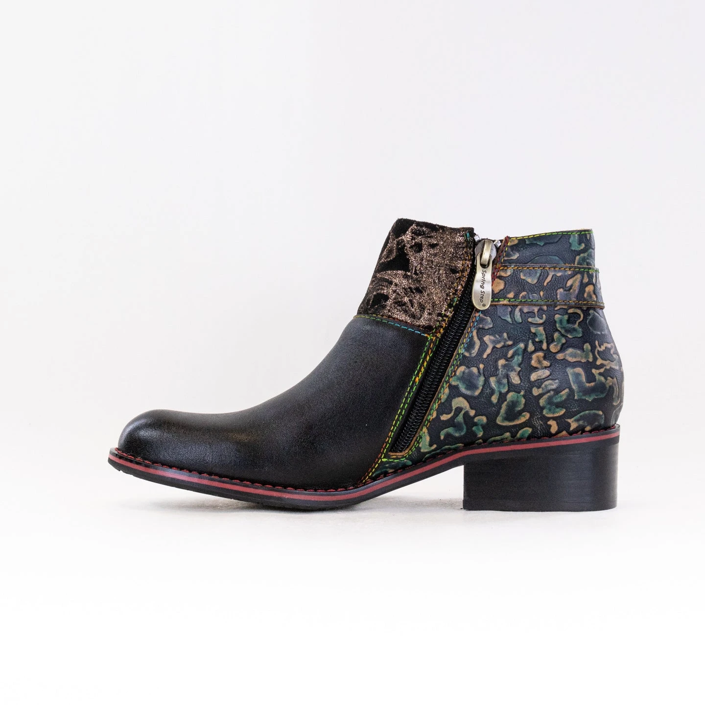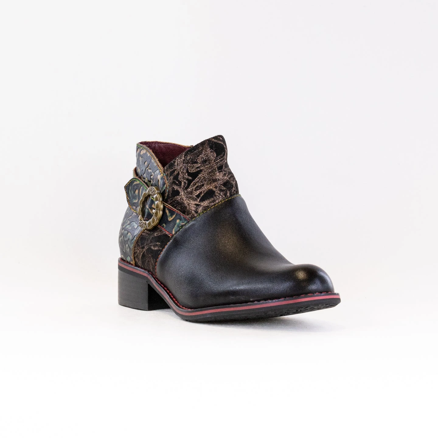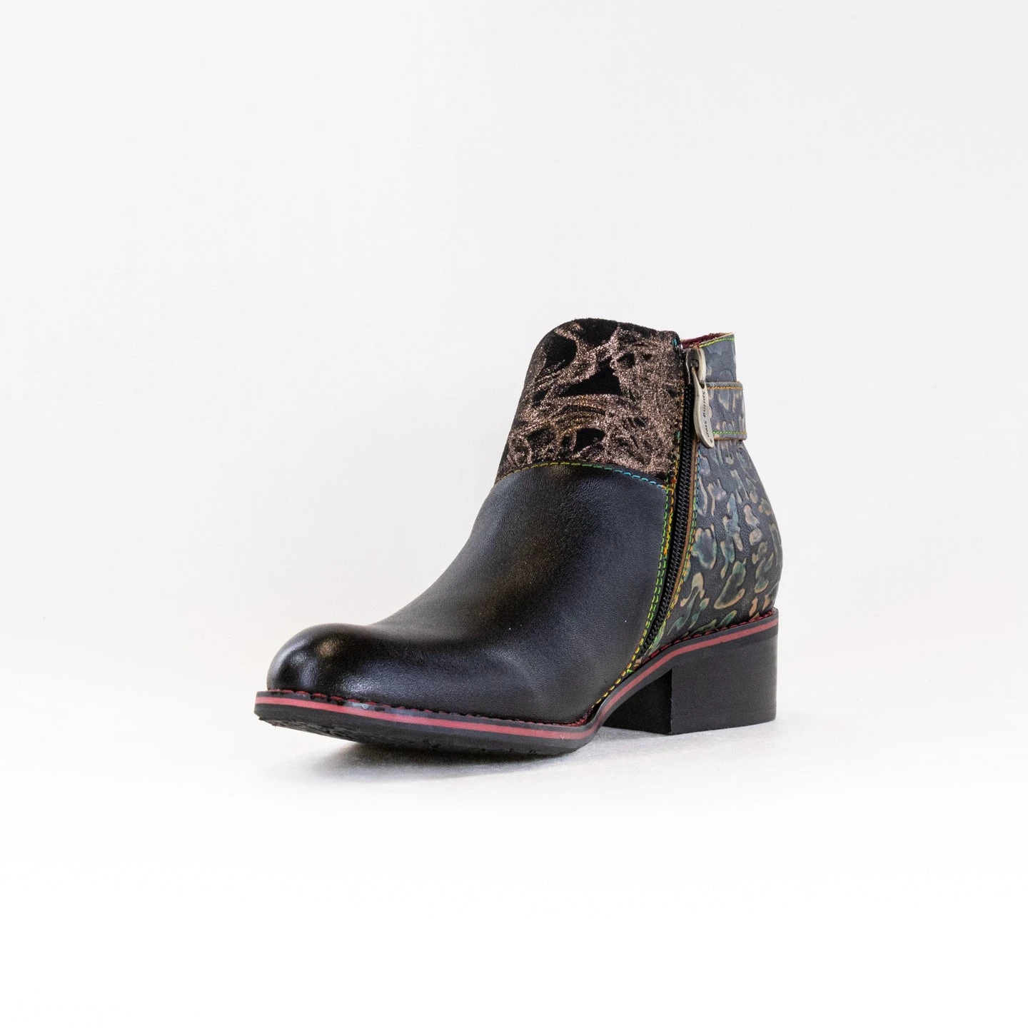 A beautiful western style bootie with a Victorian flavor, with amazing four(4) strap refined bow style antique buckles and end strap embellishments, in a combination of full grain burnished polished leather and embossed two tone floral designed hand painted leather.