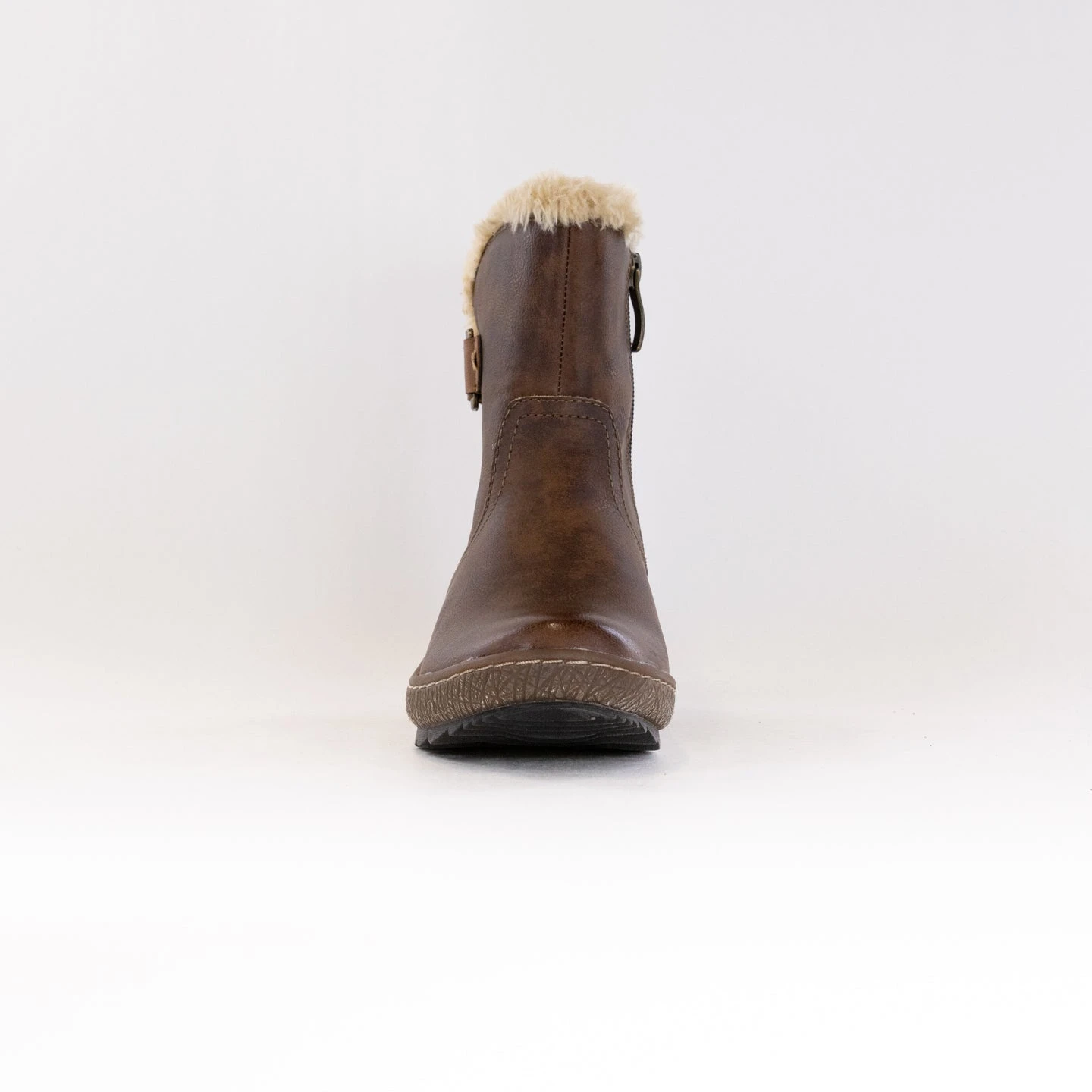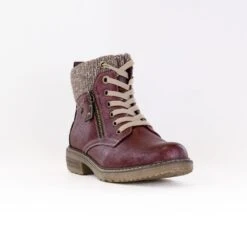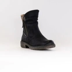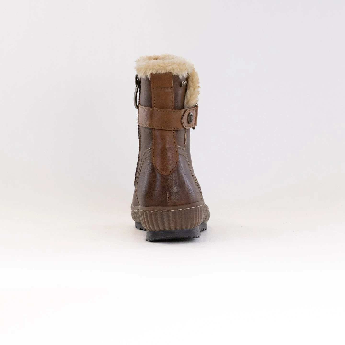Trendy and functional, water resistant short boot, trimmed with faux fur and detailed with a decorative strap on the back shaft.