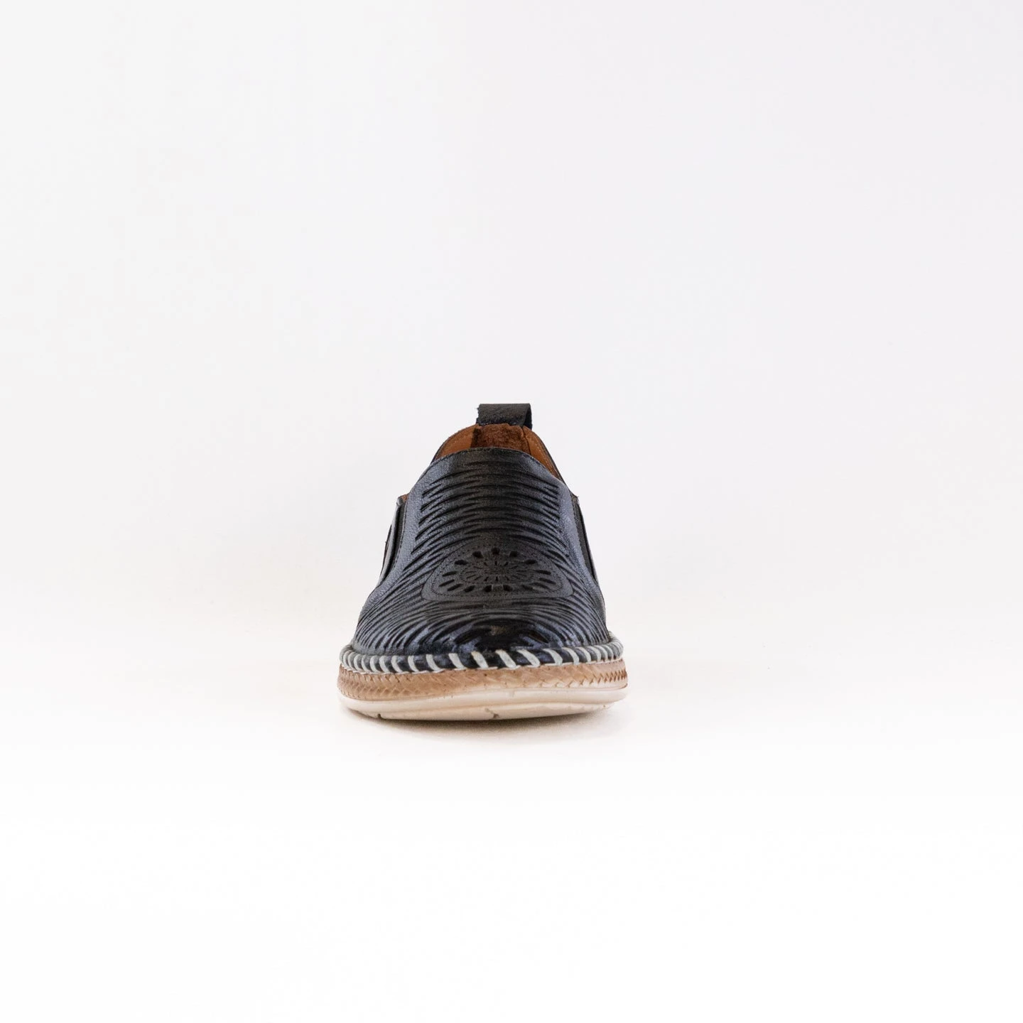 A casual shoe with an accordion upper and beautiful laser cut medallion. Stitched construction and a double-sided gore along with a removeable and super padded footbed. On a unique braided outsole.
