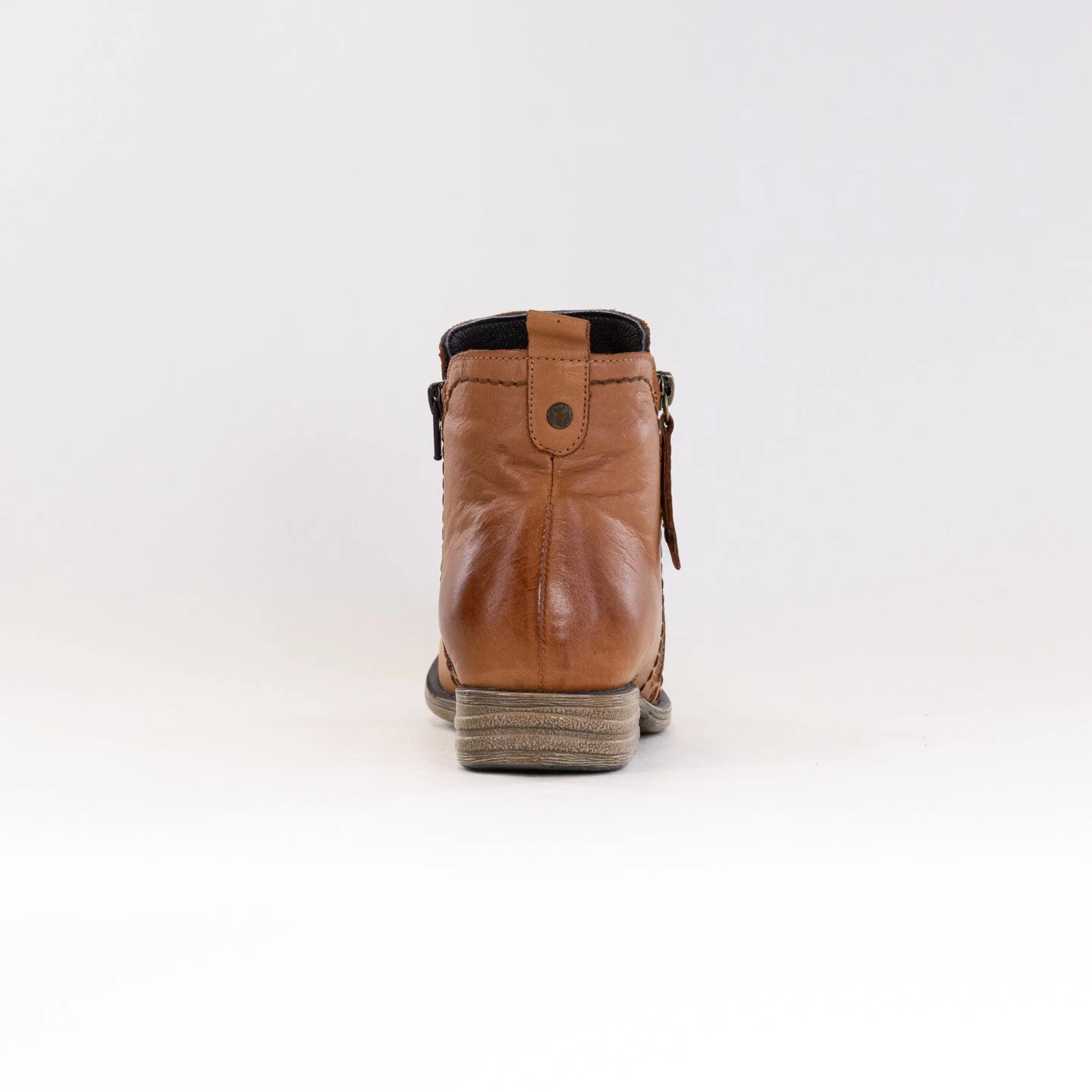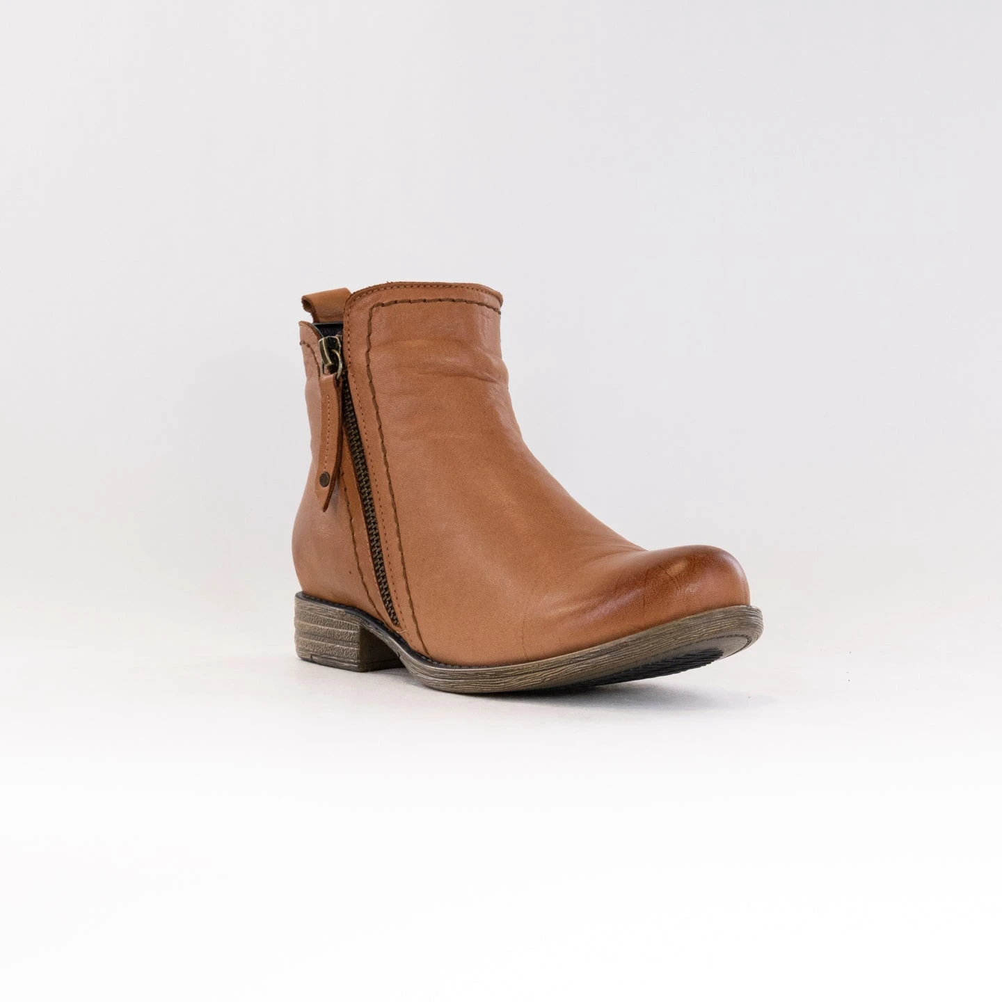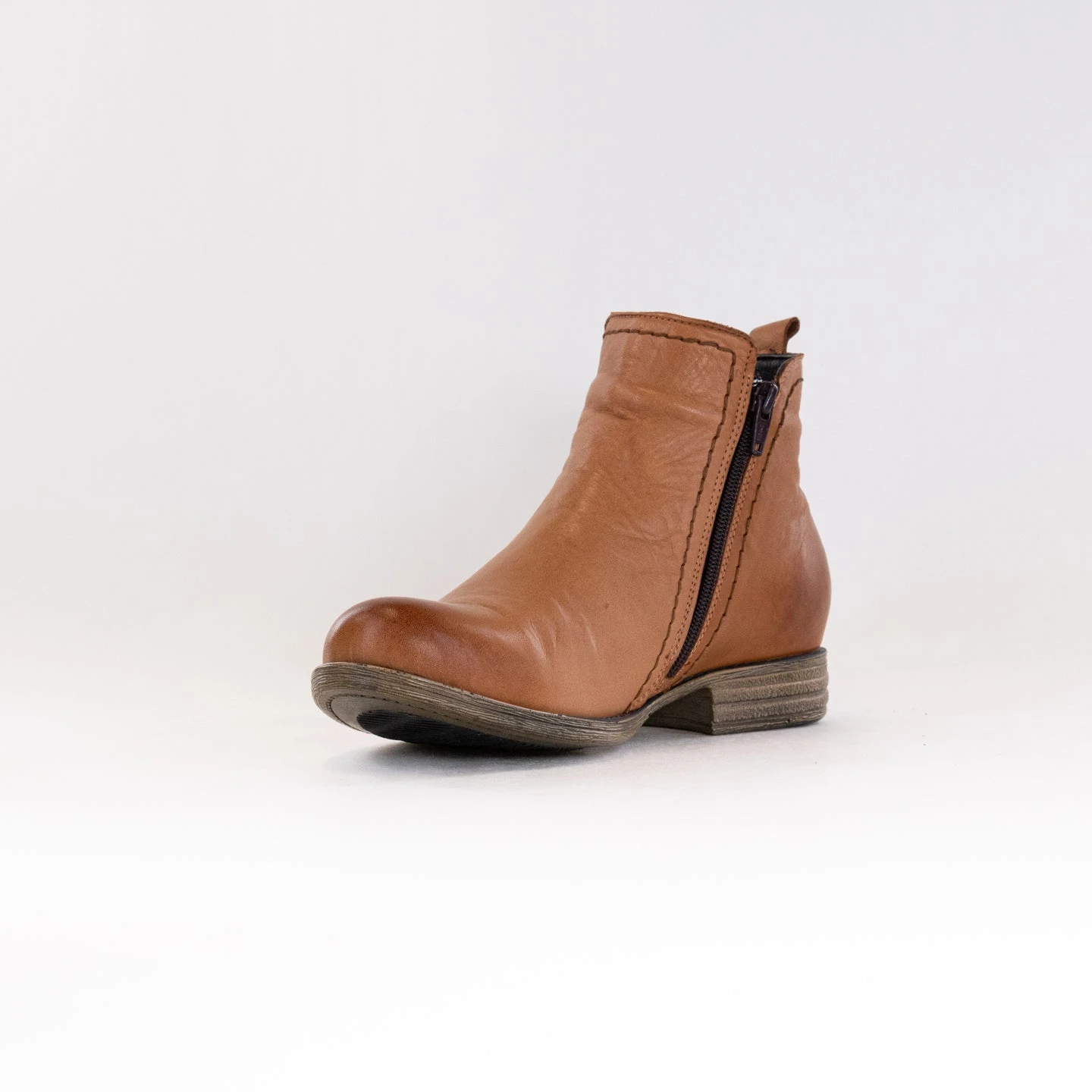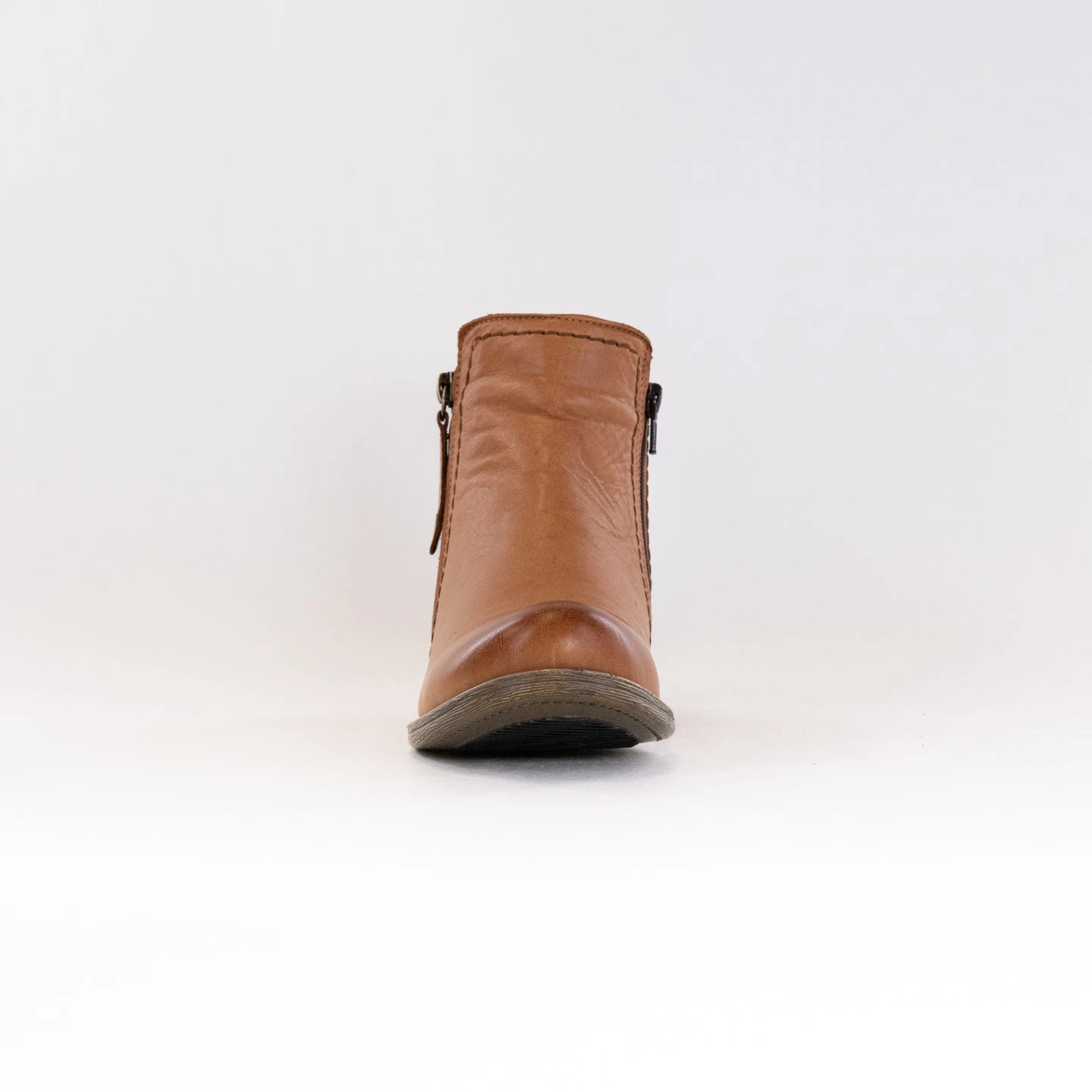 Classic leather bootie featuring a decorative outside zipper with a studded leather zipper pull, functional inside zipper, back pull up tab and thick accent stitches all on a flat, chunky heel.